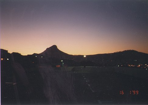 Nach etwa 11 Stunden Flug landeten wir dann um 10:45 Uhr Ortszeit in Johanesburg. Um 12:00 Uhrt starteten wir dann in Richtung Kapstadt, wo wir um 14:00 Uhr landeten. Als wir am Flughafen unseren Leihwagen (einen Mercedes 220) in Empfang nehmen wollten, stellte sich heraus, dass für uns "nur" ein Audi A4 2.4 V6 zur Verfügung stand. Nachdem wir das Gepäck gerade mal so untergebracht hatten, gings dann erstmal rechts sitzend und links fahrend in Richtung unseres Hotels (Holiday Inn Garden Court). Nach dem Check-In machten wir die ersten Fotos von Kapstadt.